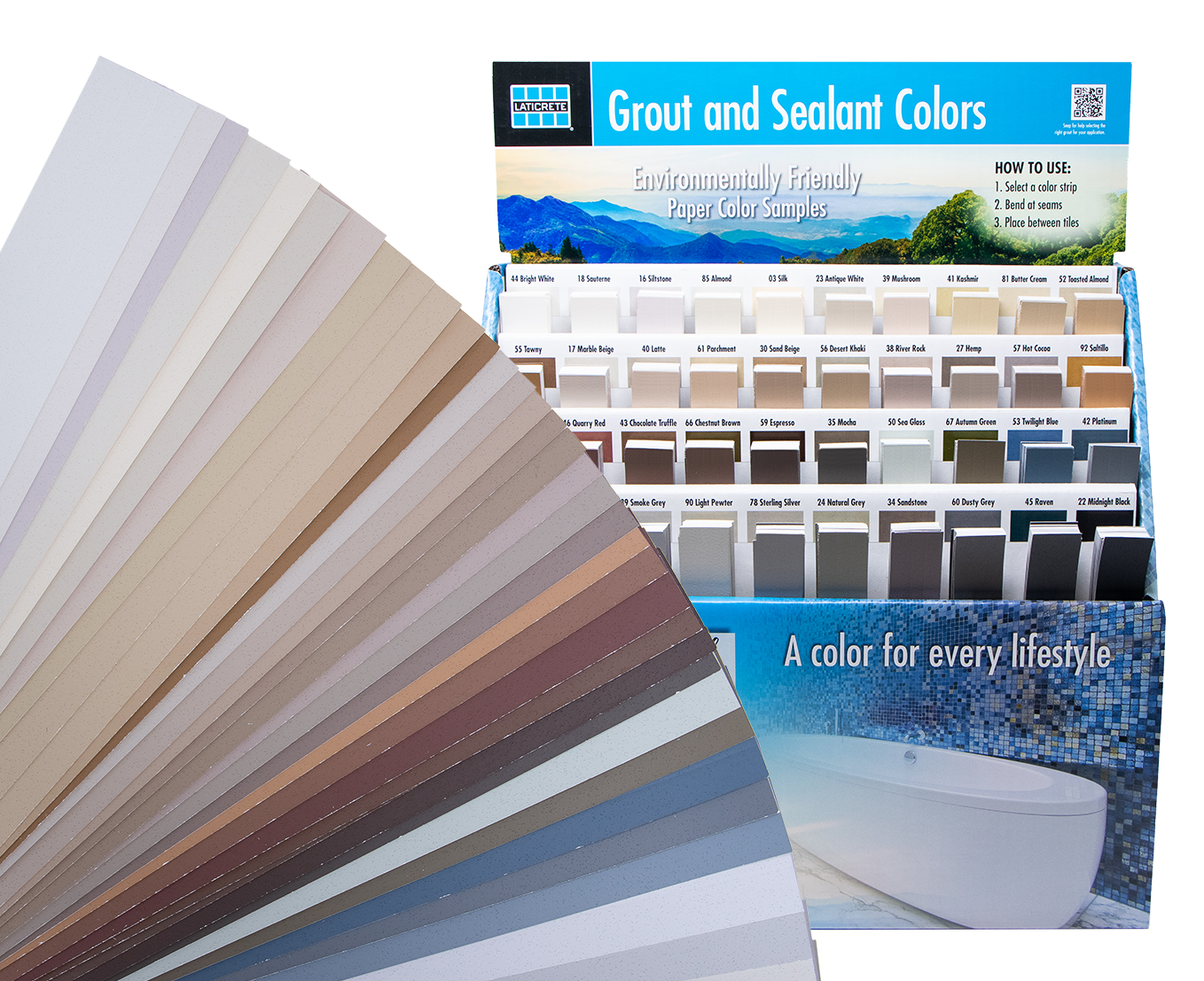 Das Eco Grout Color Selector-Tool bietet alle 40 Standardfarben und enthält 8-Zoll-Papierkanäle mit Farbabscheidung. Mit Perforationen lassen sie sich leicht falten und an die gängigsten Fugengrößen anpassen und eignen sich auch ideal für Einreichungspakete, Moodboards und mehr.