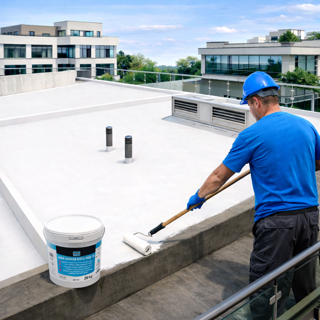 AQUA BARRIER WHITE ROOF FR is a fiber-reinforced liquid waterproofing membrane based on synthetic resins in water dispersion.
